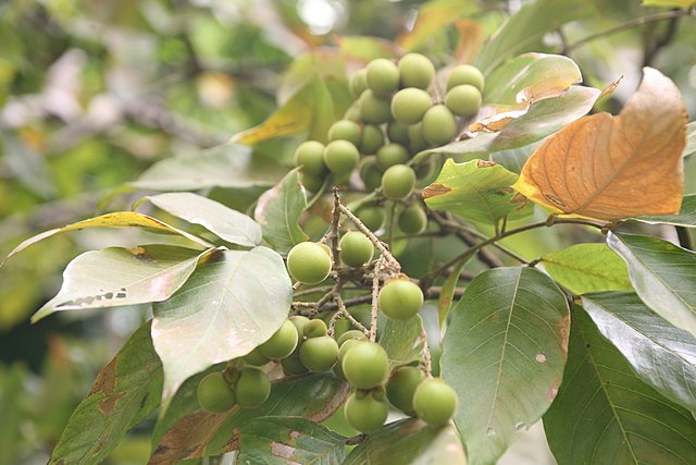 Au bout des branches, des petites drupes vertes sont présentes et deviennent marron en tombant. Chaque drupe contient une graine noire, dure et luisante.