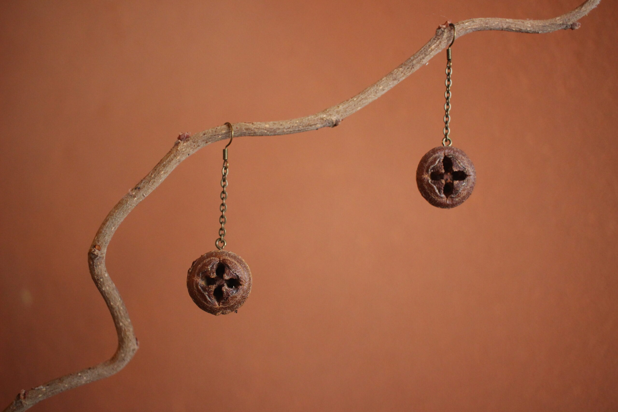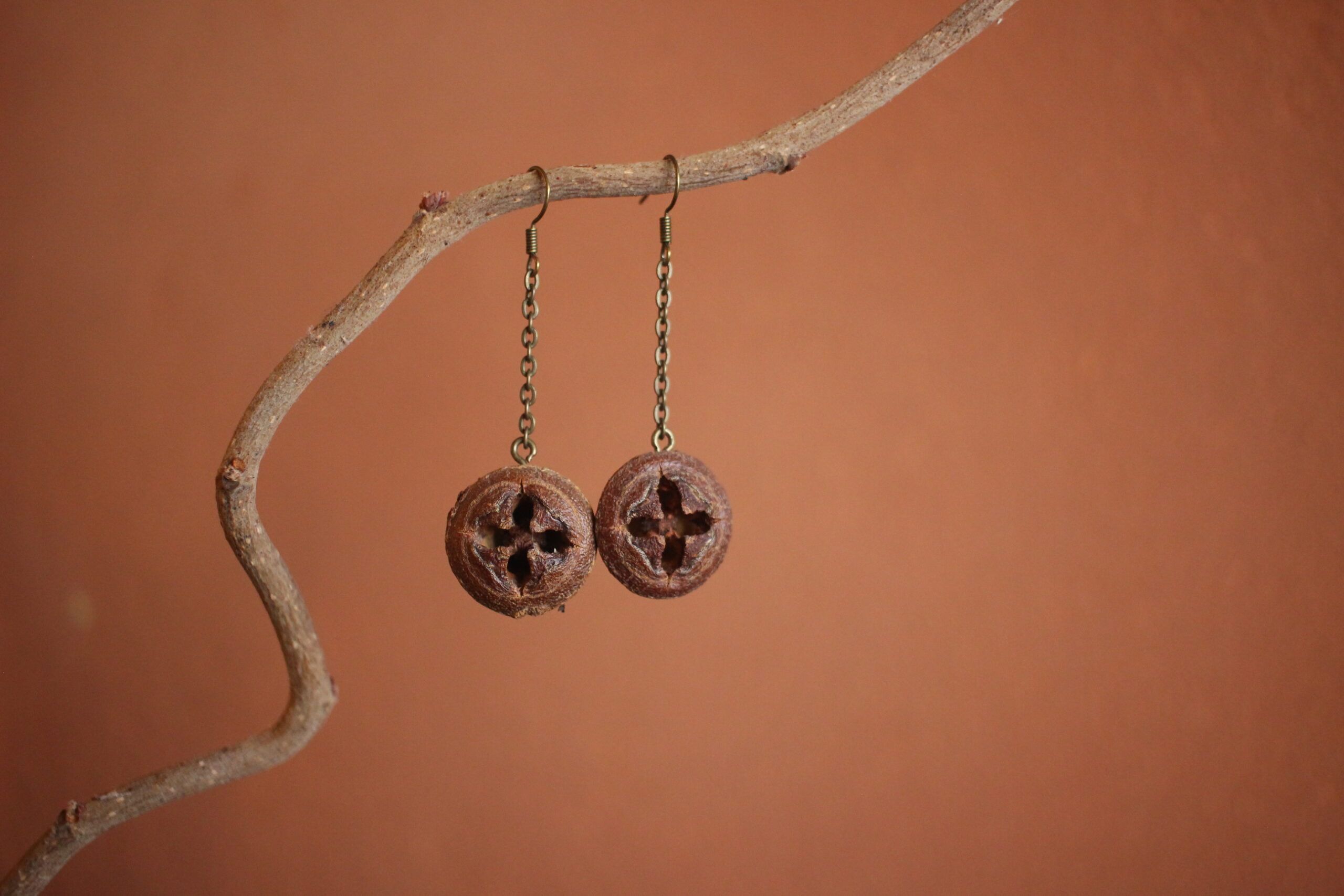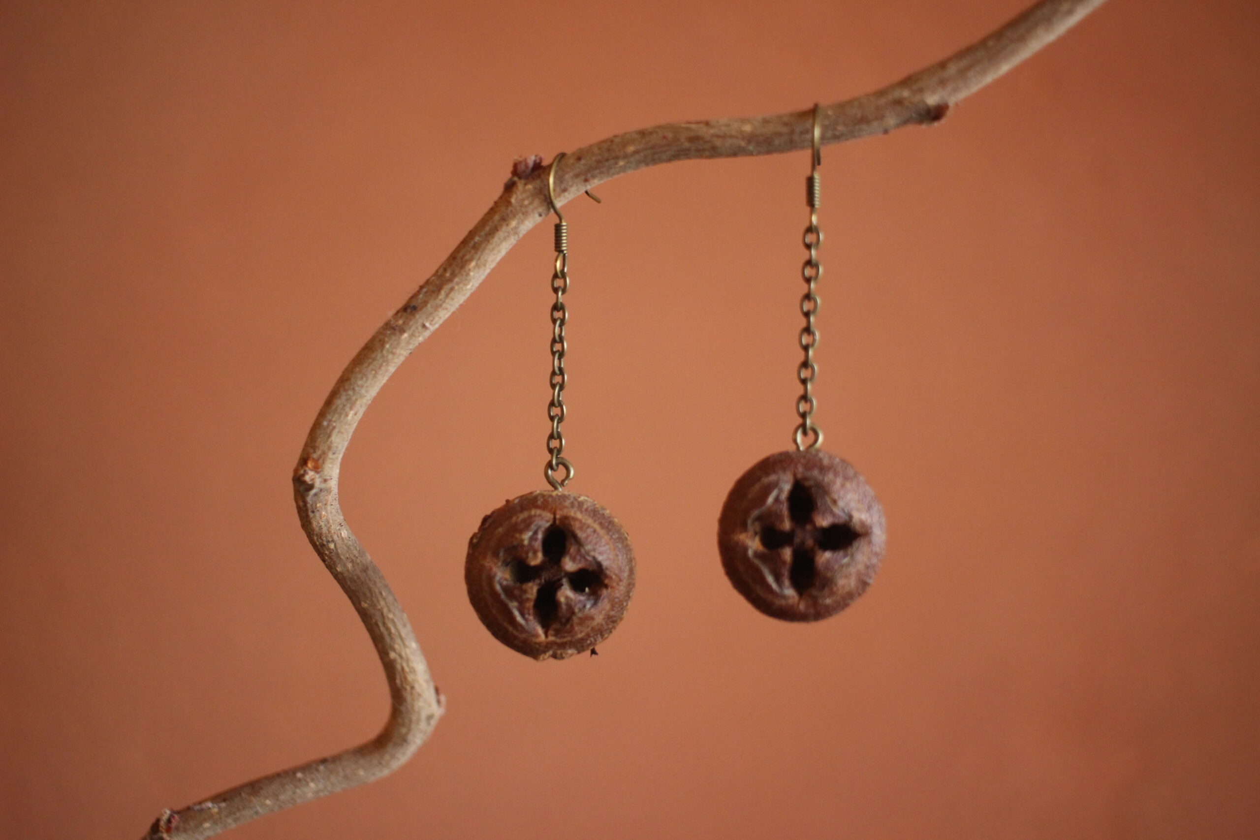 Paire de boucles d’oreilles composée de graines d’eucalyptus, récoltées dans le sud de la France, au bout d’une chaînette en laiton, couleur bronze.