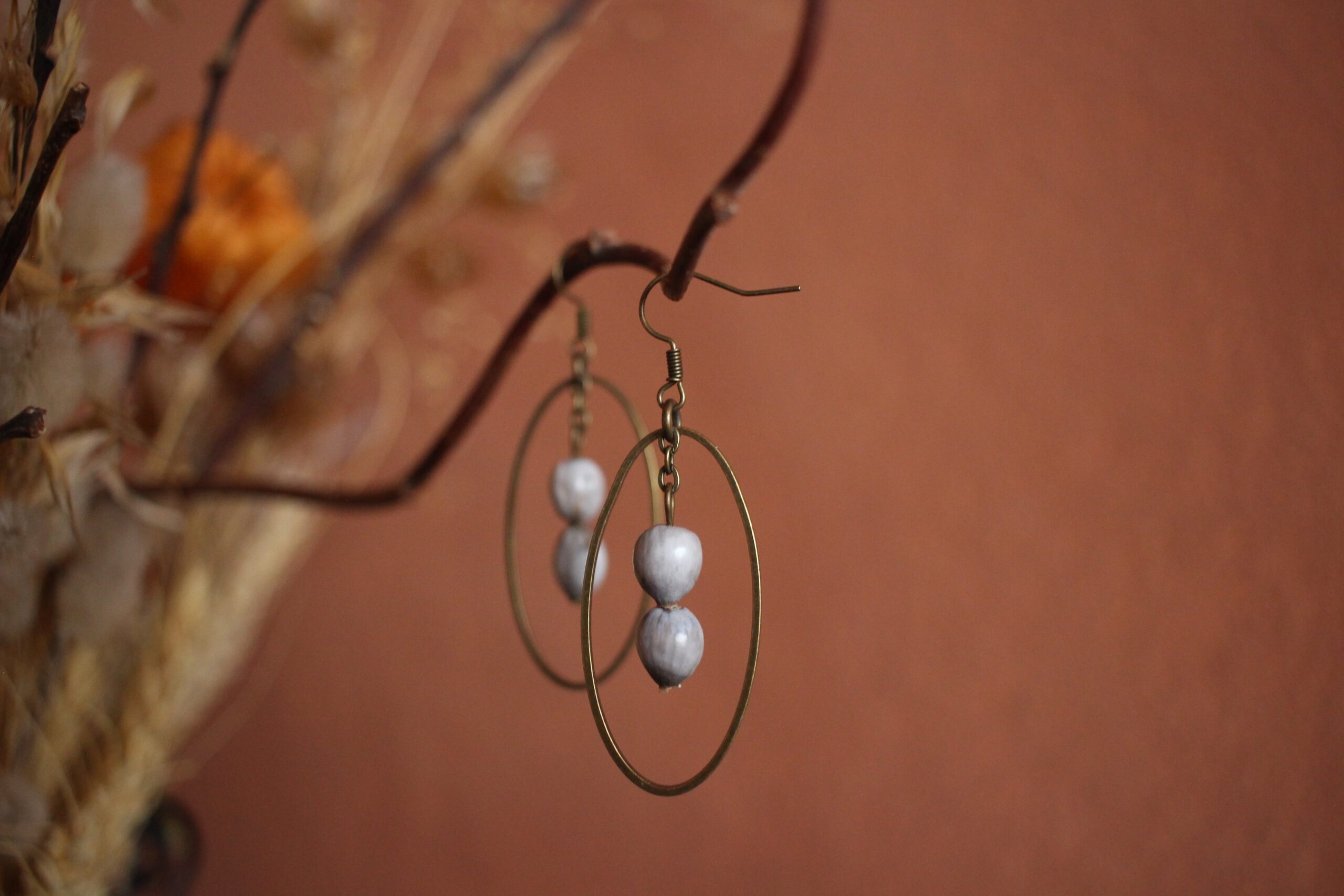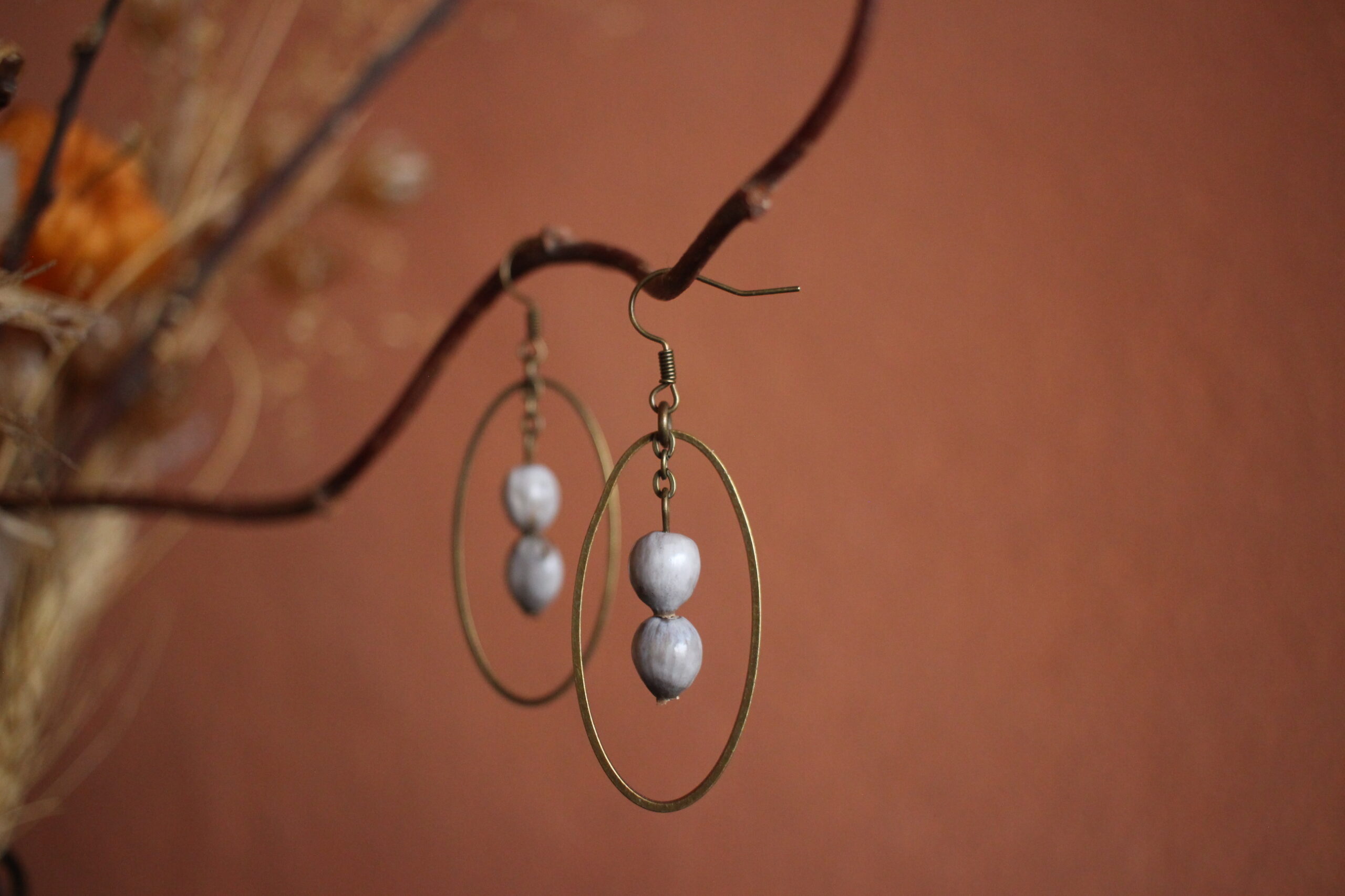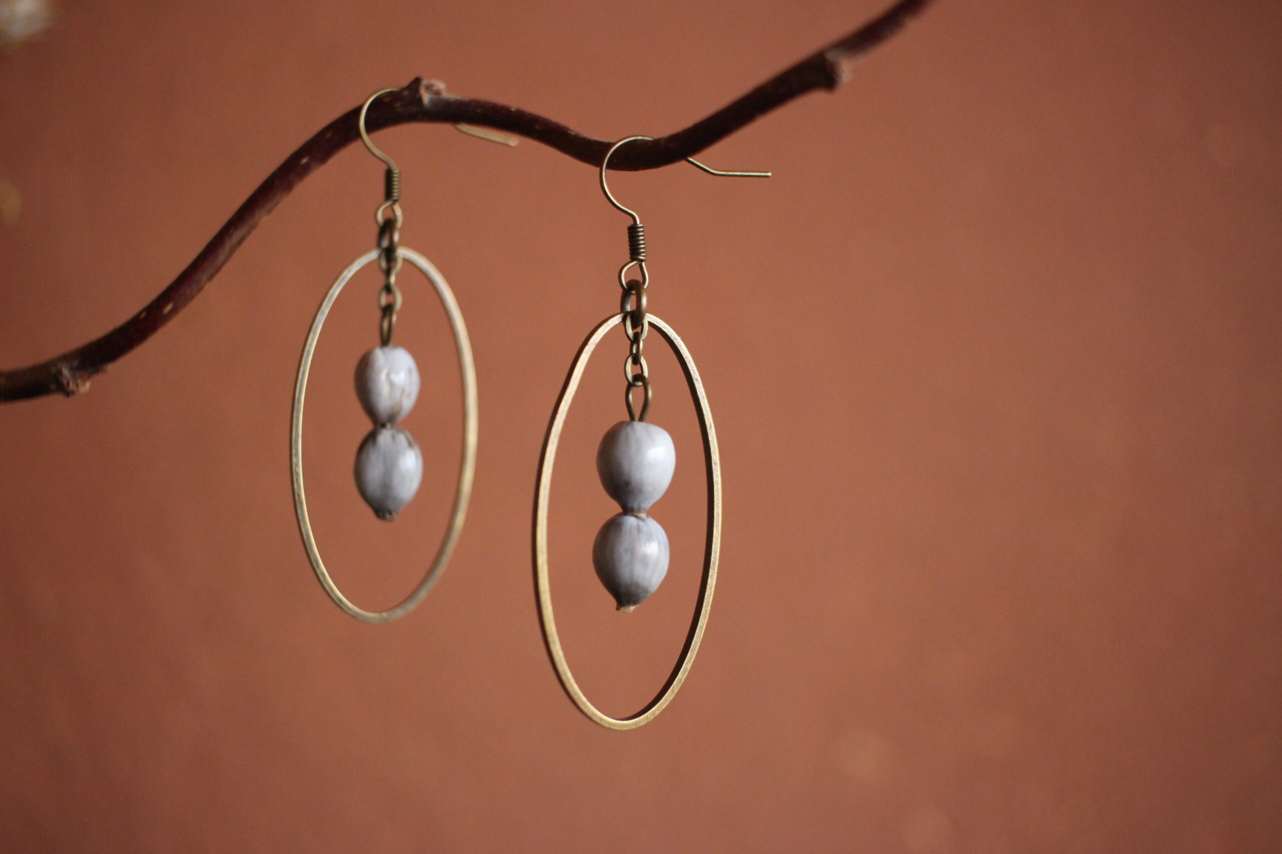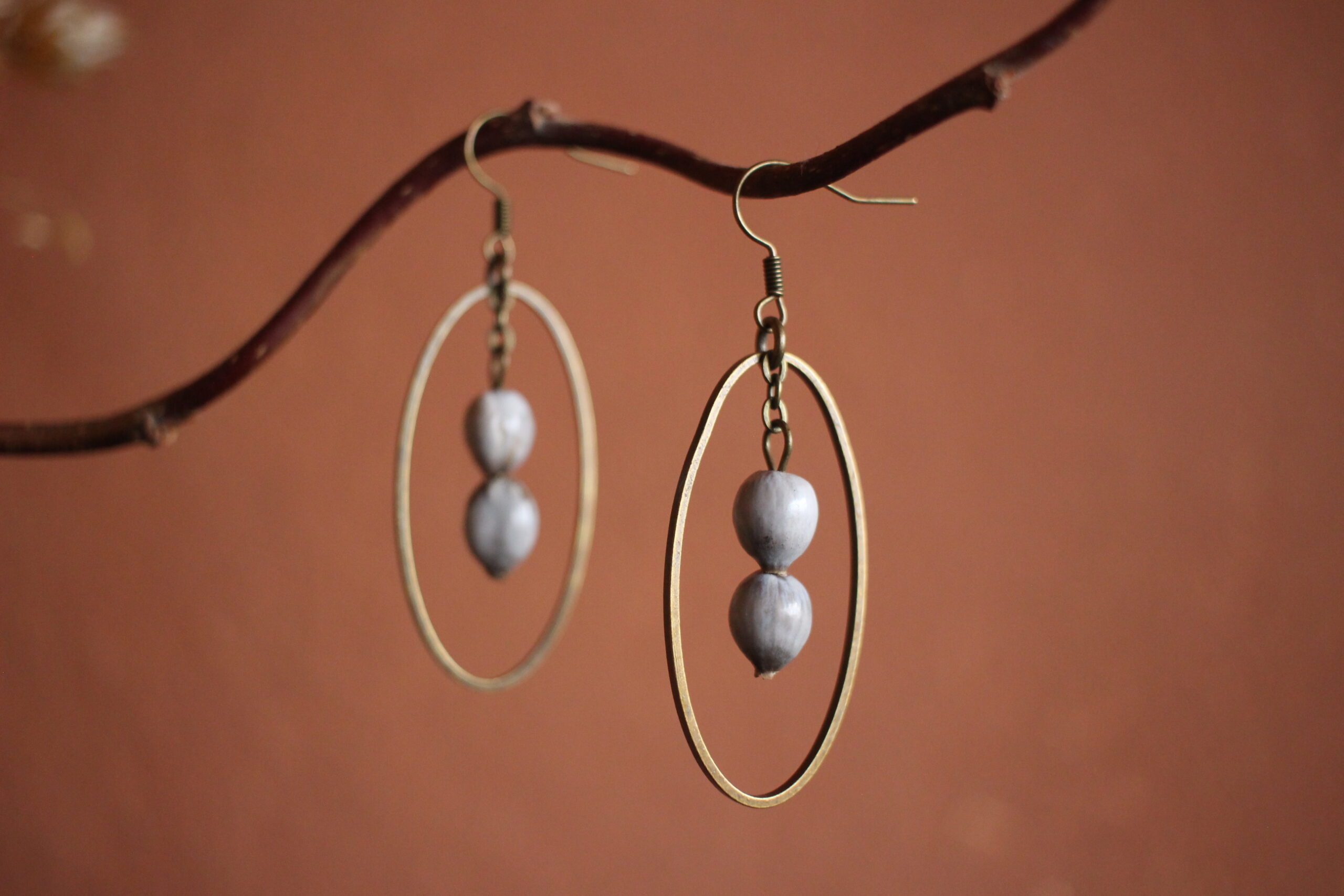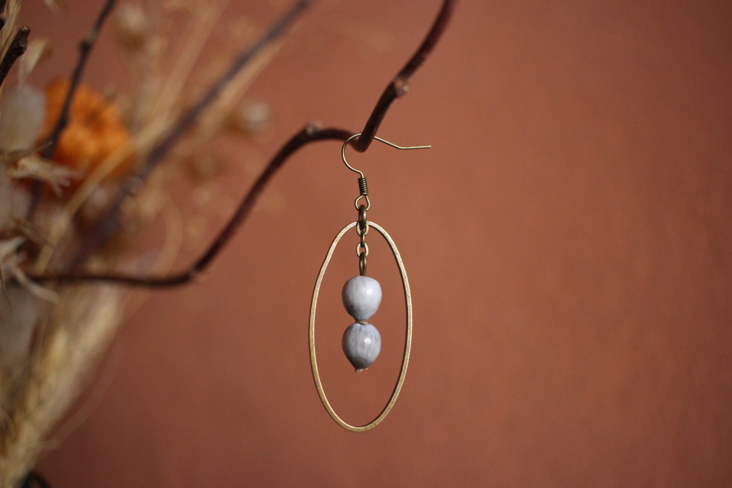 Paire de boucles d’oreilles composées d’un ovale en laiton et de deux larmes de job, de couleurs gris/blanc.