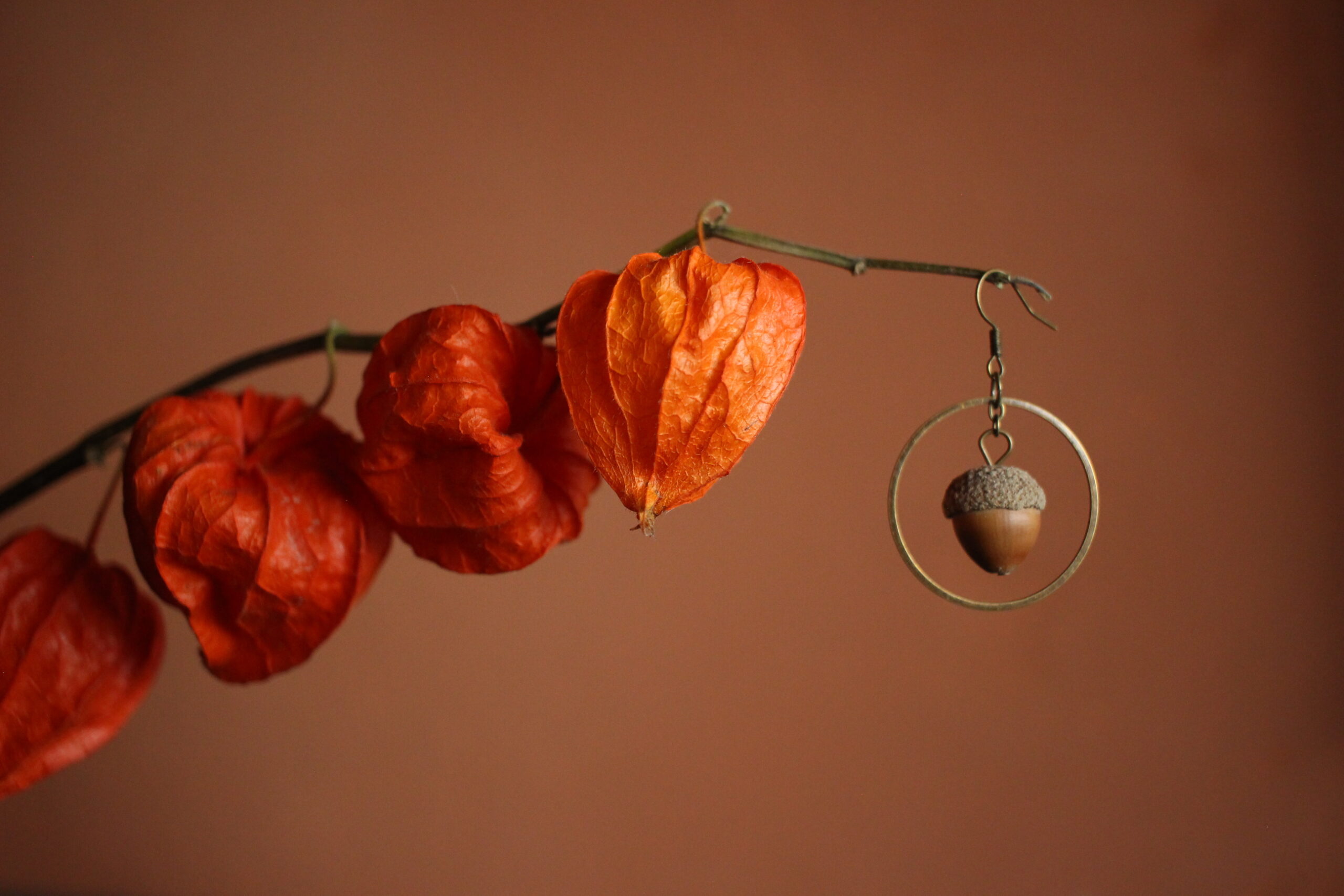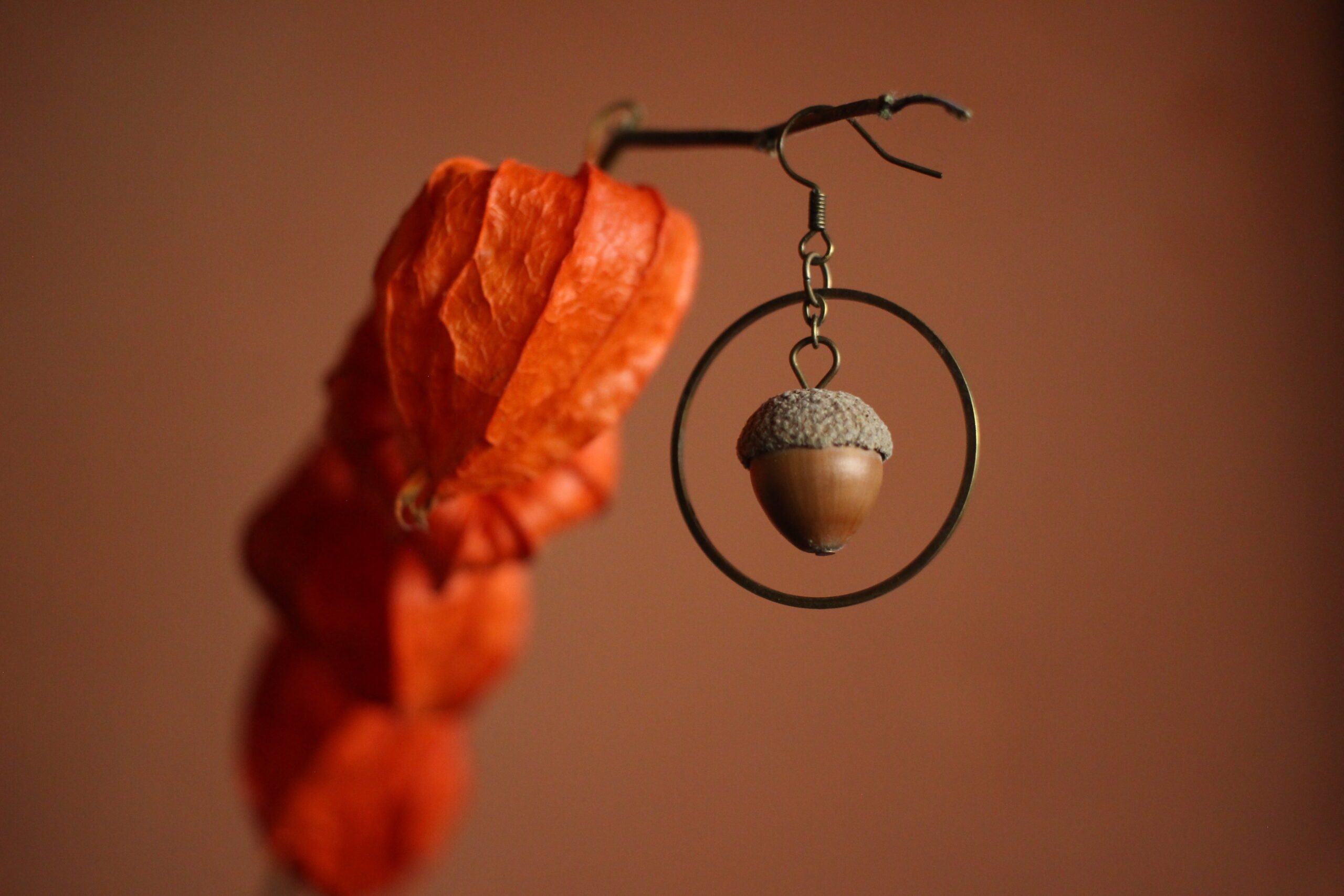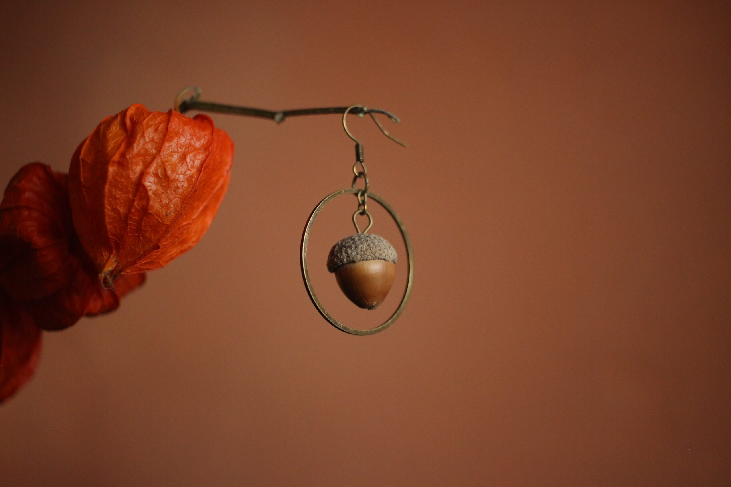 Paire de boucles d’oreilles composées d’un rond et d’une petite demi lune en laiton et d’une noisette.