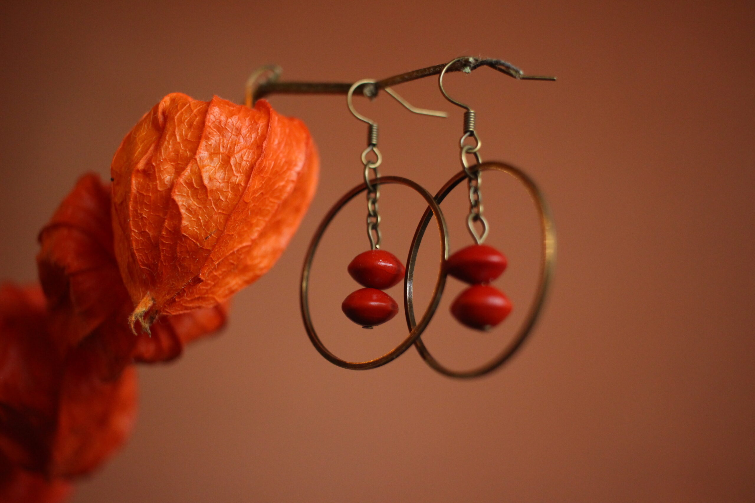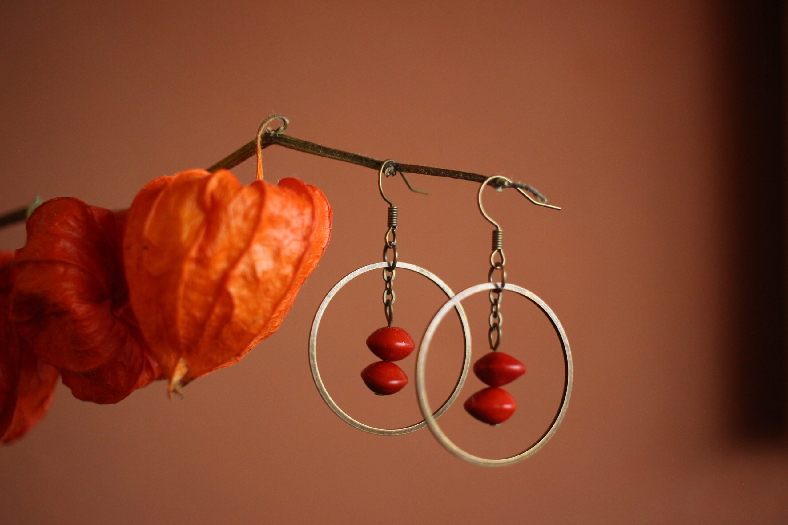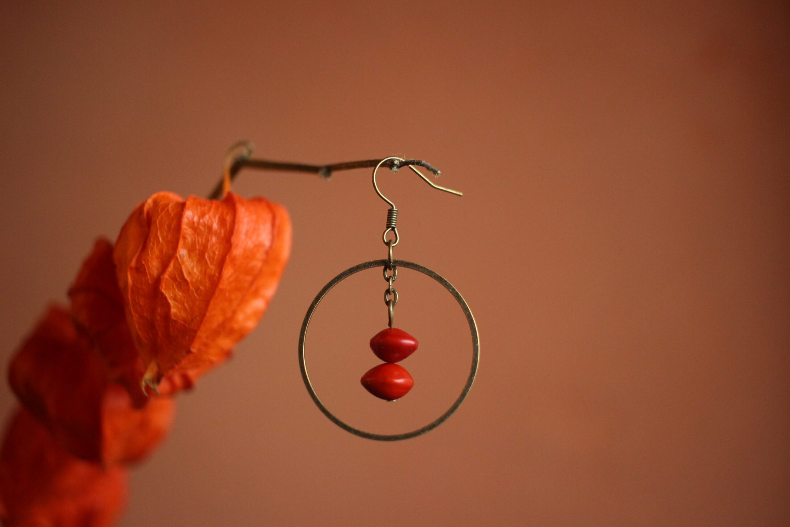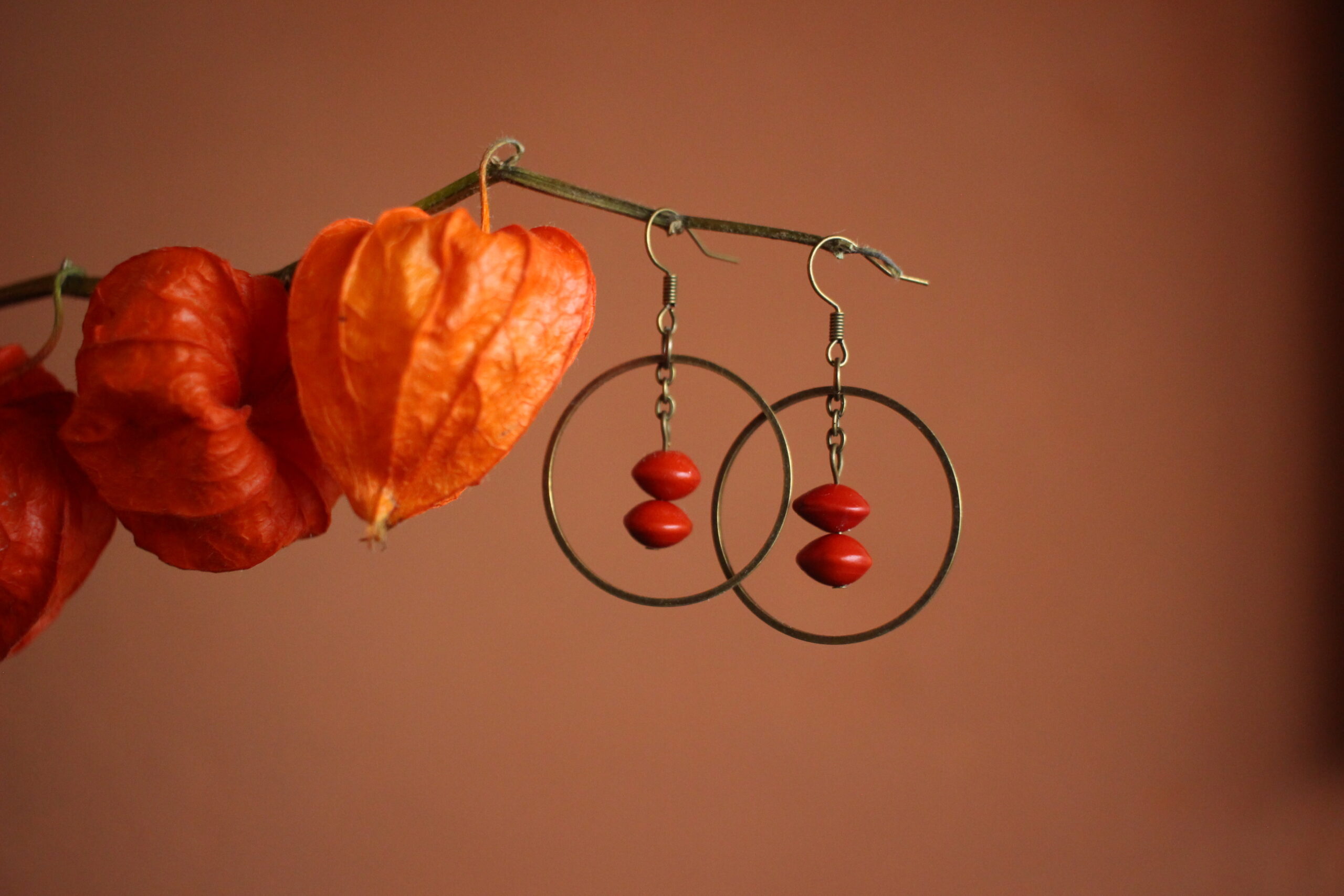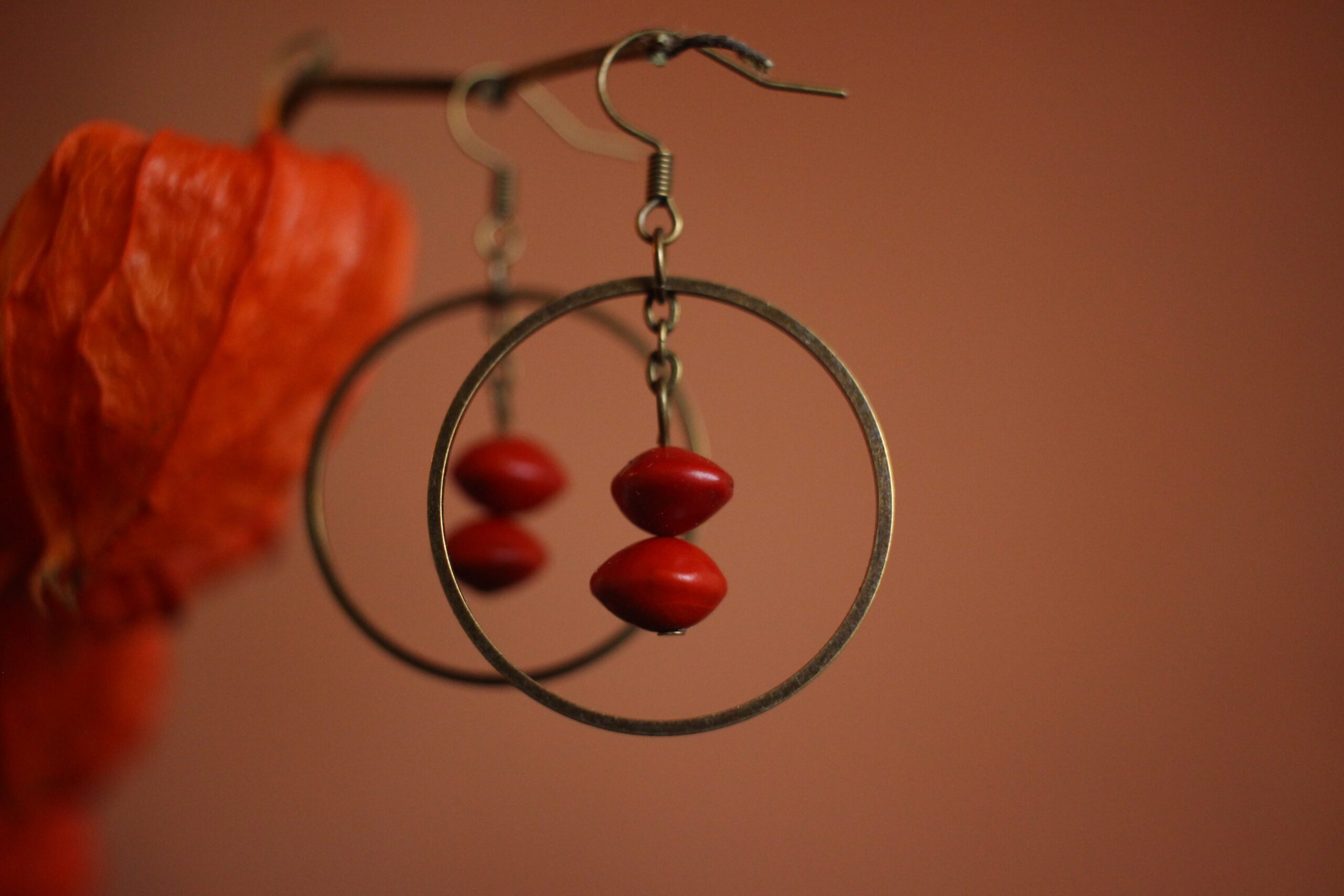Paire de boucles d’oreilles composées d’un rond en laiton (couleur bronze) et de deux graines rouges, aussi appelées graines de cardinalier.